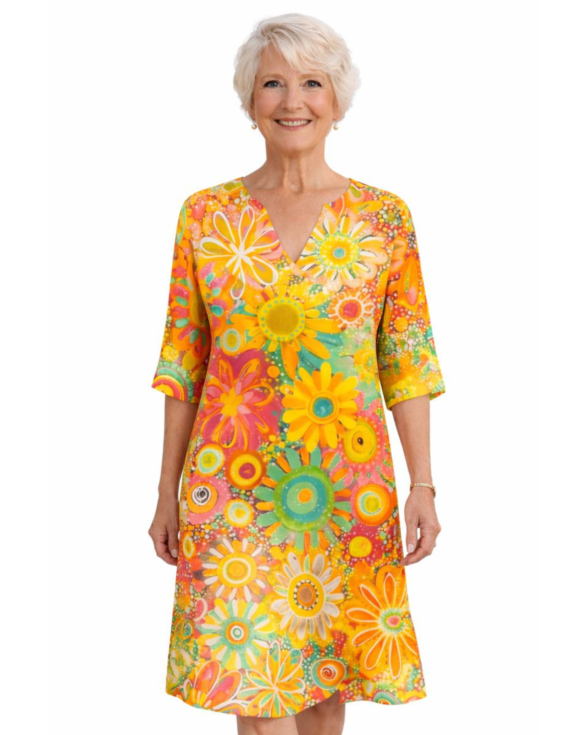 The Hailey Dress brings sunshine wherever you go. With its cheerful floral print and relaxed fit, this dress is perfect for warm, easygoing days. The flattering V-neckline and above-the-knee length give it a playful yet polished feel, making it ideal for brunches, beach walks, or summer get-togethers.